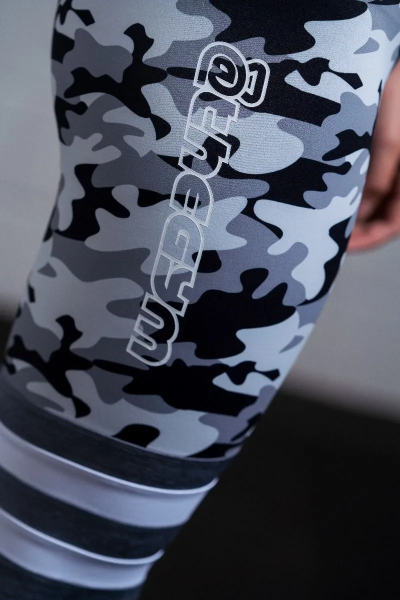 - Two-tone: Upper-leg is Grey-Camo, divided by white loops and all-black lightweight lower-leg