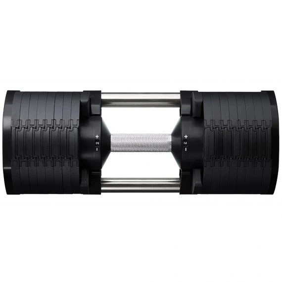 When stored, the patented click mechanism enables you to adjust the weight by turning the easy-grip, knurled handle. When in use, the mechanism blocks the rotating function of the handle and thus protects against unintentional rotation. With the slim design of the dumbbells they offer good opportunities for a comprehensive range of exercises. Thanks to the compact shape, the dumbbells have the same potential as that of a large set of dumbbells without requiring the space.
