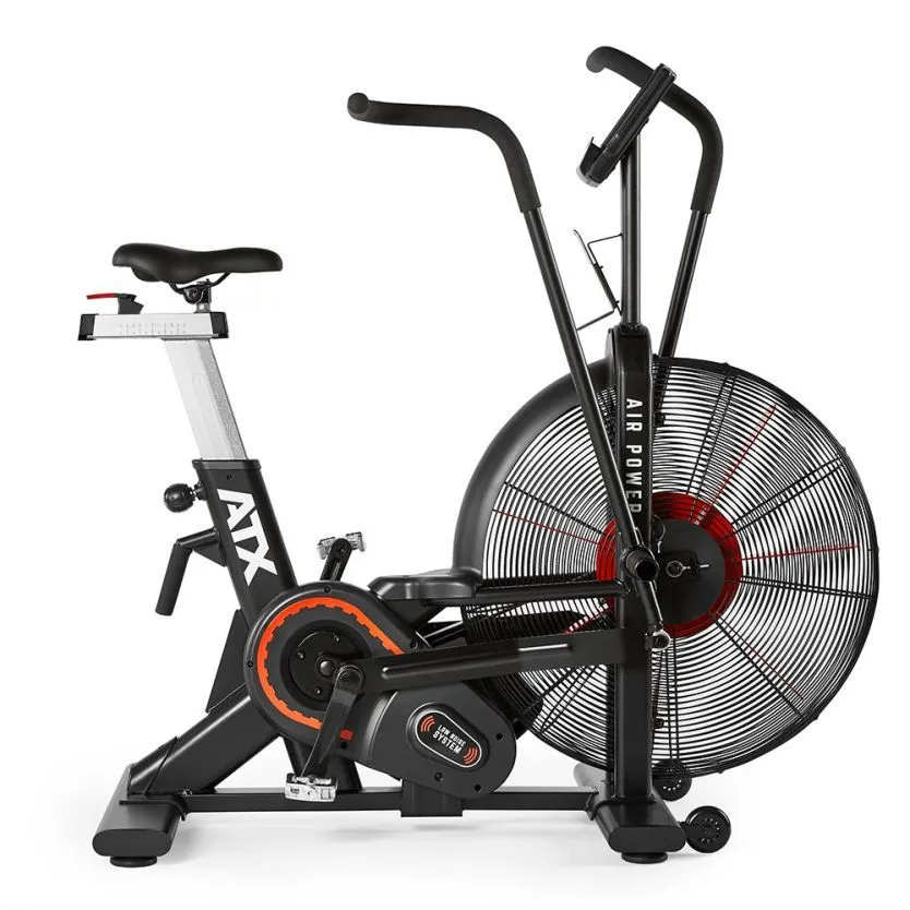 The ATX air power bike is a HIIT bike that uses air resistance to increase the input effort. The bike can work both lower and upper body at the same time to make the over all work you harder. The air bike is great for increasing your overall health as well as you cardio and endurance. the Bike has a robust tubular steel construction with extra stable articulated axles. The foot pedals and arms are forged steel with high-quality ball-bearings for a smooth operation. It has a low noise chain belt drive. The seat can be adjusted both horizontally and vertically. Comes with a console / LCD monitor that is independent of mains power / battery operation (Delivery including battery) with a display of: total time, time, distance, calories, watts, pulse.