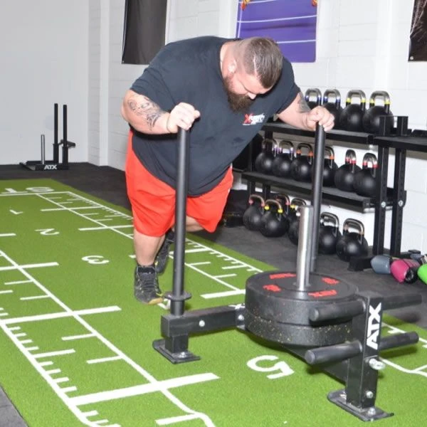 The speed track consists of green and white single-stranded PE synthetic fibres which are firmly anchored in a tear-proof fabric fleece. (Letters, numbers and marks are NOT printed!) The Speed Track is therefore extremely hard-wearing and abrasion-resistant! The Speed Track offers a wide range of applications – from sprinting and jumping training to the pulling of heavy equipment, such as sled training. Due to the high fibre density in crimped form, the artificial grass does not show any pressure depressions, even under high permanent load. The marked area is 10m in metre grids – digits 1 to 10, and additional fine intermediate markings, allow for fast and exact detection of speed and distance. The Speed Track has a 1 meter long start (denoted by START) and finish area, altogether, a total length of 12m results. The width is 2m.