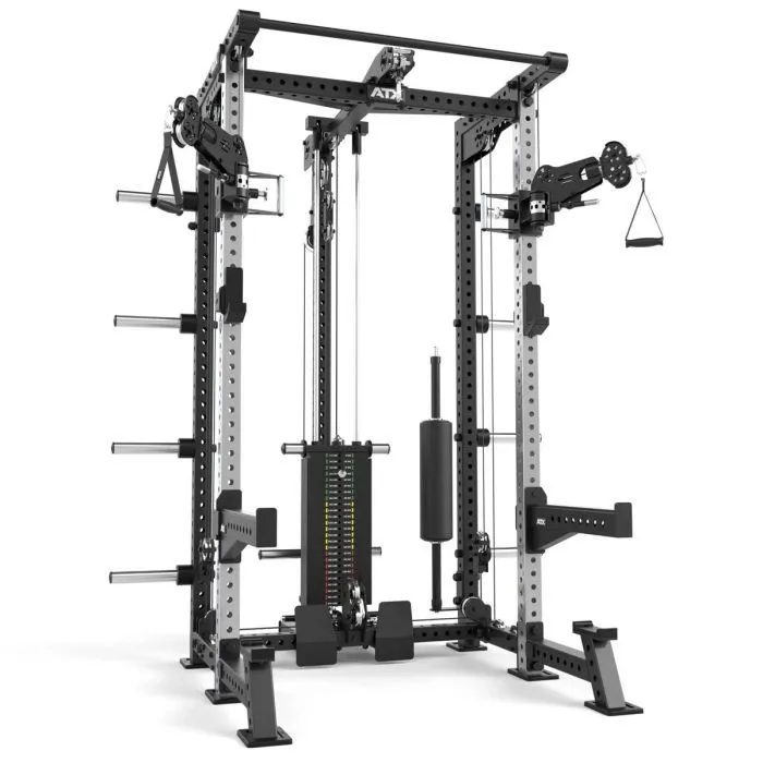 Fully-equipped from the Start: Includes J-hooks, safety spotter arms, a lat pulldown station with leg support, a low-row station with adjustable footrest, four cable pull points, X-Tender Arms for cable crossovers and angled pulls, a multi-grip pull-up bar, deadlift front support, and eight plate storage posts.