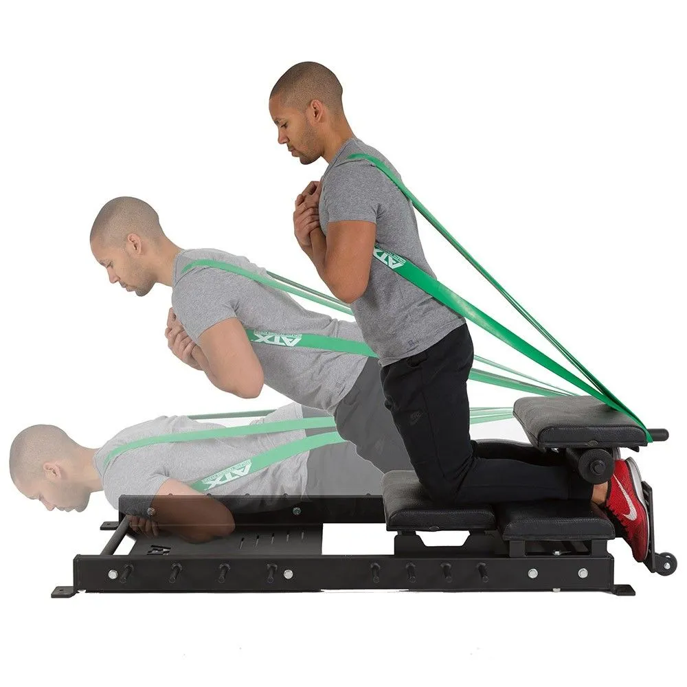 Multi-use bench for a variety of exercises, including floor-level reverse hamstring curls, kneeling hip extension and hip thrusts. Band pegs travel the length of the unit in order that resistance can be added easily.